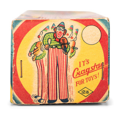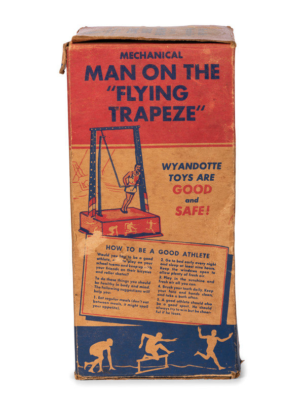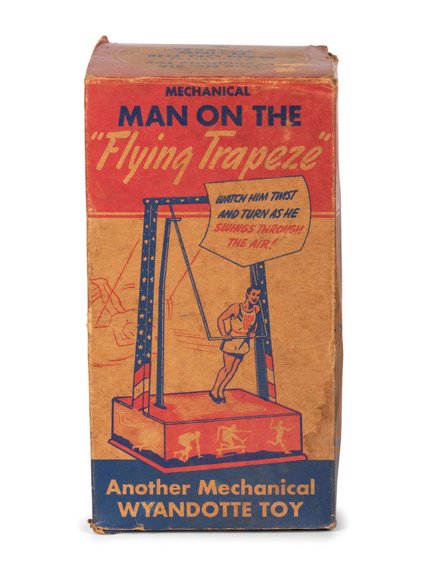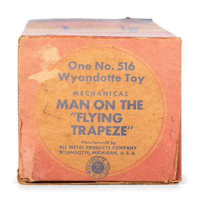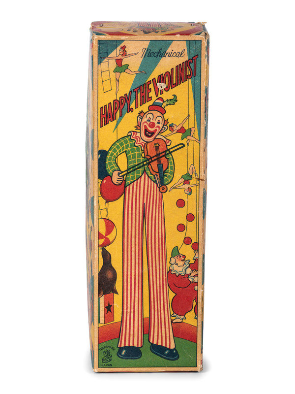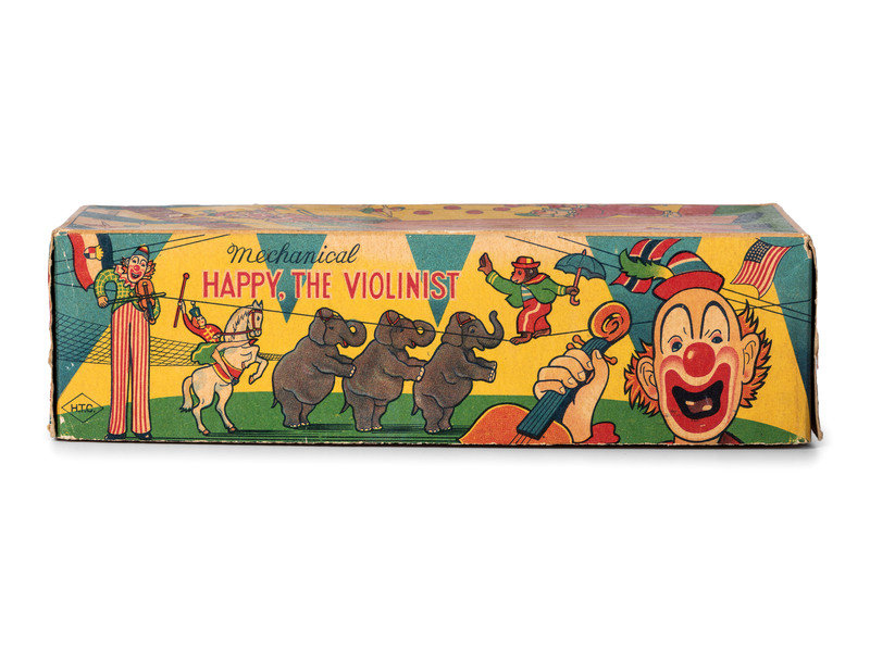 comprising a US Metal Toy Co. noise maker, a Marx windup skating clown, a Wyandotte tin trapeze toy with box, a Japanese 'Happy the Violinist' windup toy with box, a clown and cart windup toy, and a Marx 'Musical Circus Horse' pull toy.