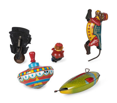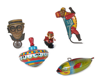 comprising a German 'Harold Lloyd' bell ringer toy, a Chein mechanical fish, an Ohio Art Co. spinning top with zebras, and a Marx 'Zippo' climbing monkey with original box.
