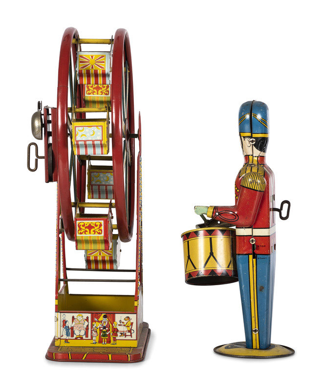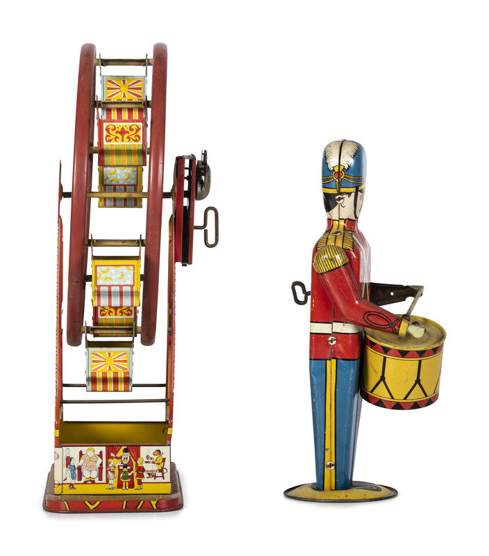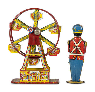 comprising a J. Chein lithograph "Hercules" Ferris wheel and a Wolverine toy solider.