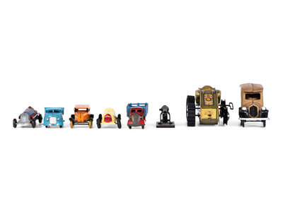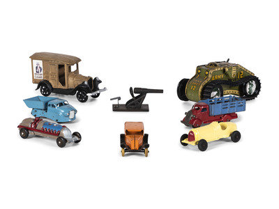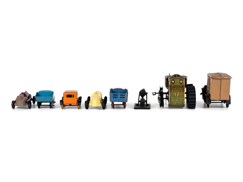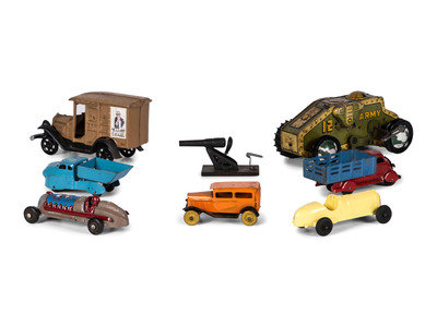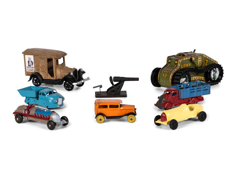 including a Marx tin lithograph tank, a cast iron 'Army Mail' truck, four painted tin automobiles, a painted metal race car, and a toy cannon.