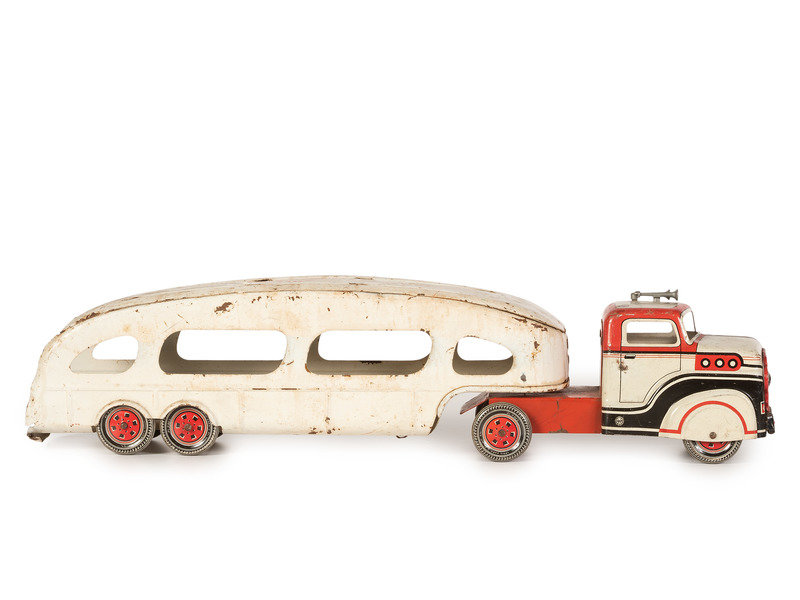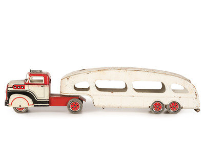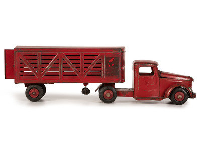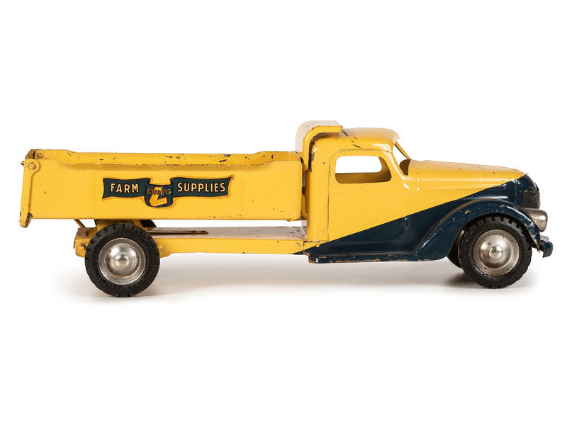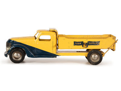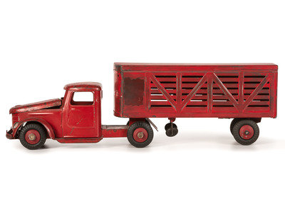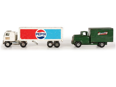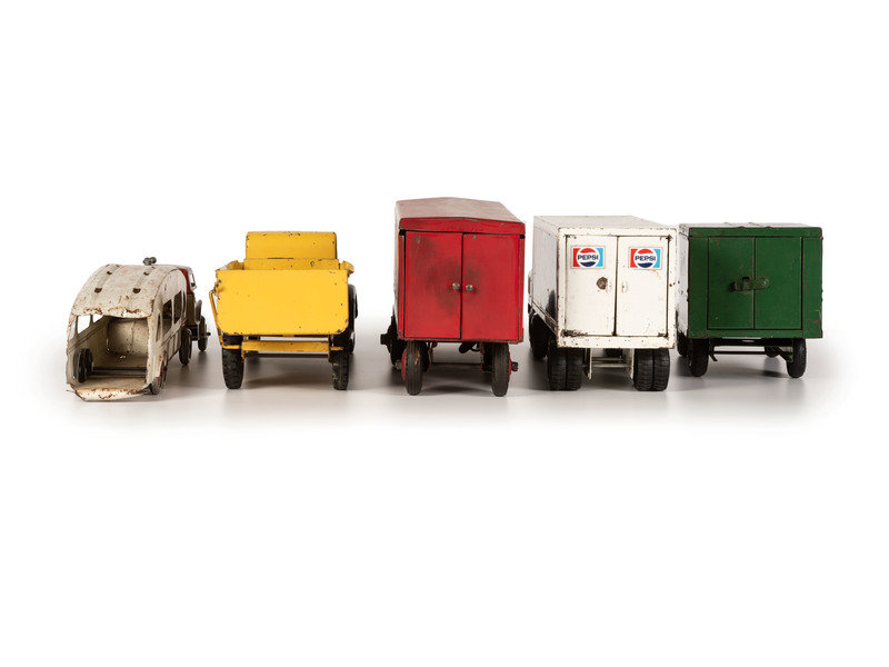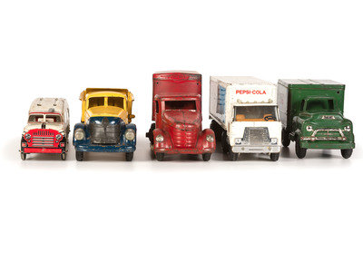 comprising a tin Marx truck and trailer, a Buddy L 'Farm Supplies' truck, a Buddy L 'Airway Express' van, a red painted truck and livestock trailer, and a pressed steel Ertl Pepsi truck.