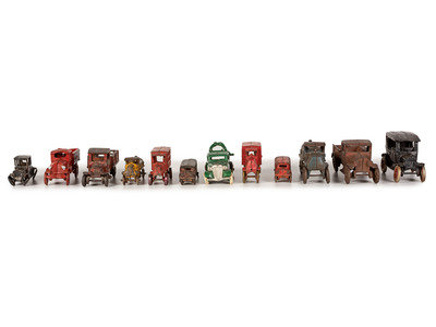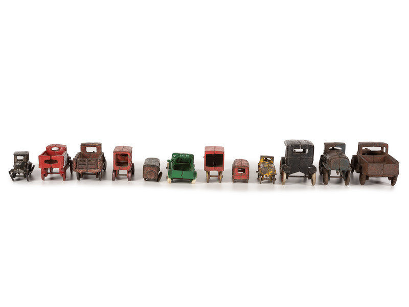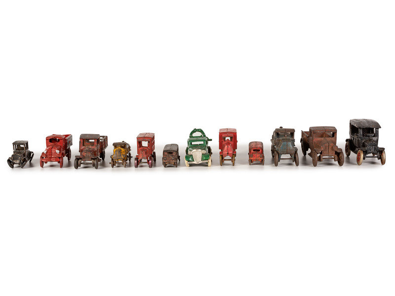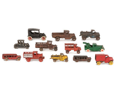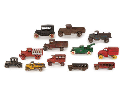 Twelve Painted Cast Iron Toy Cars, Trucks, and Buses