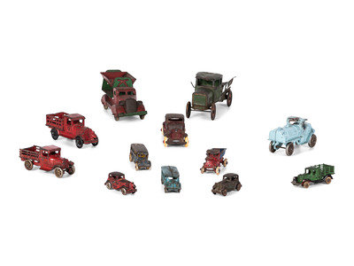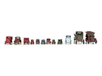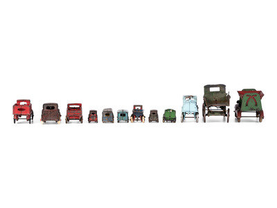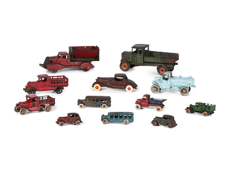 Twelve Painted Cast Iron Cars, Buses, and Trucks