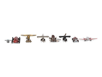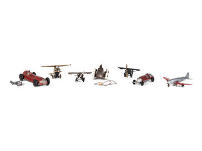 comprising an Auburn rubber car, two Hubley die cast metal cars, a Marx windup tin plane, and four other metal planes.