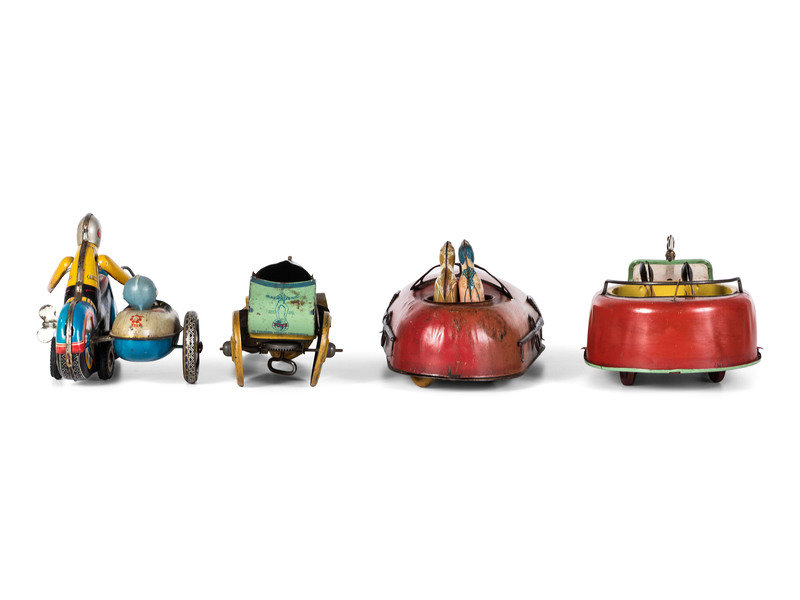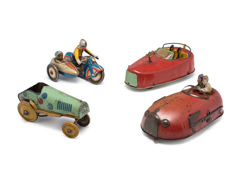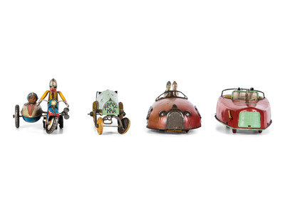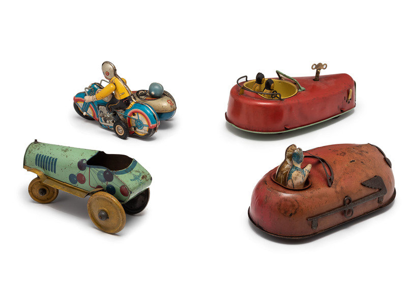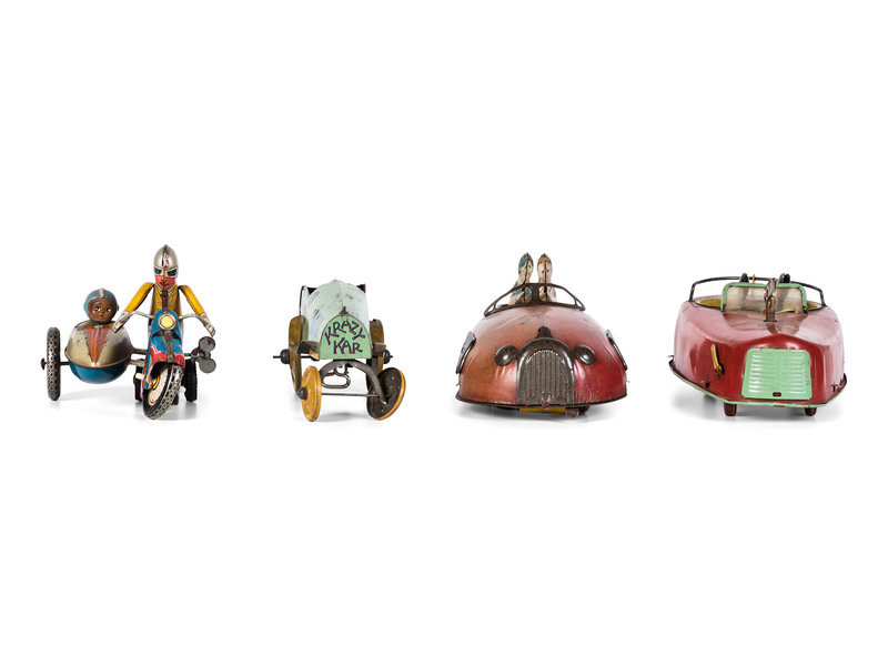 comprising a Lindstrom 'Skeeter Bug' bumper car, a racing car, a Strauss 'Krazy Kar', and a GSH motorcycle and sidecar.