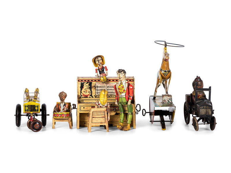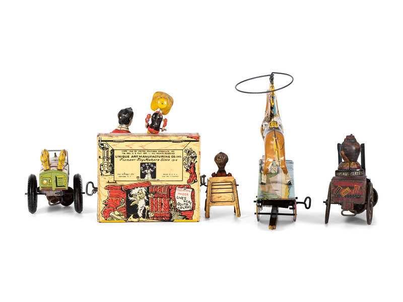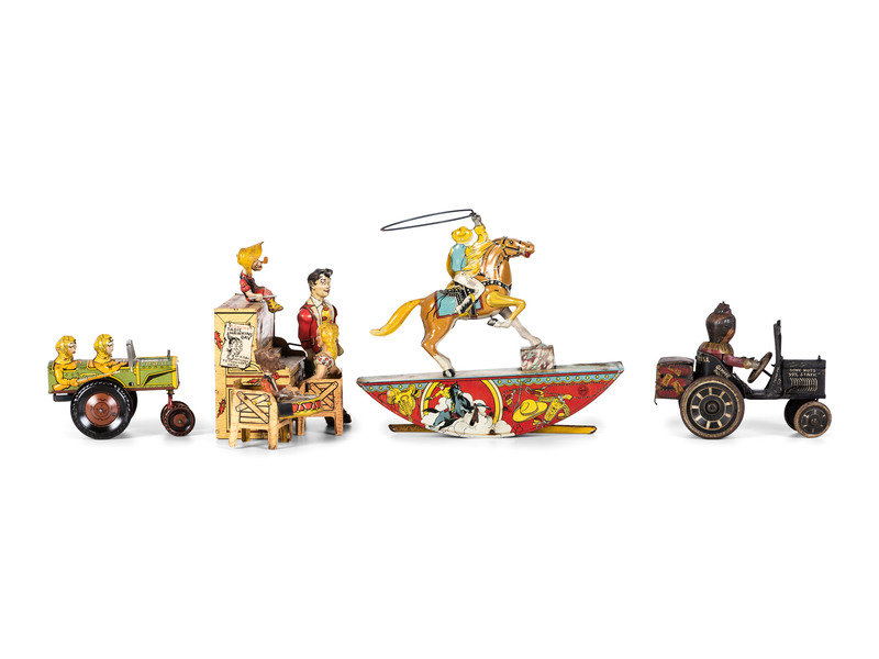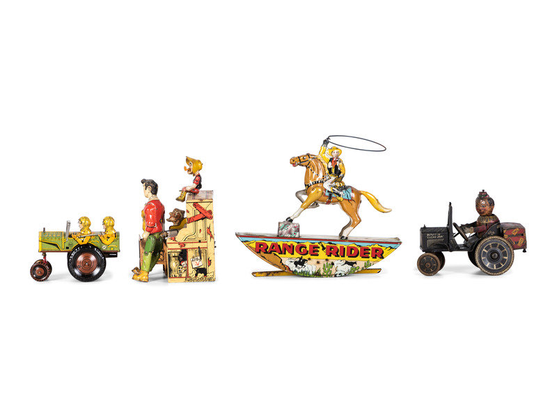 comprising a Unique Art 'Lil' Abner Dogpatch 4' band, a Marx 'Range Rider', a Marx 'Jumpin' Jeep', and a Marx 'Joy-Rider.'