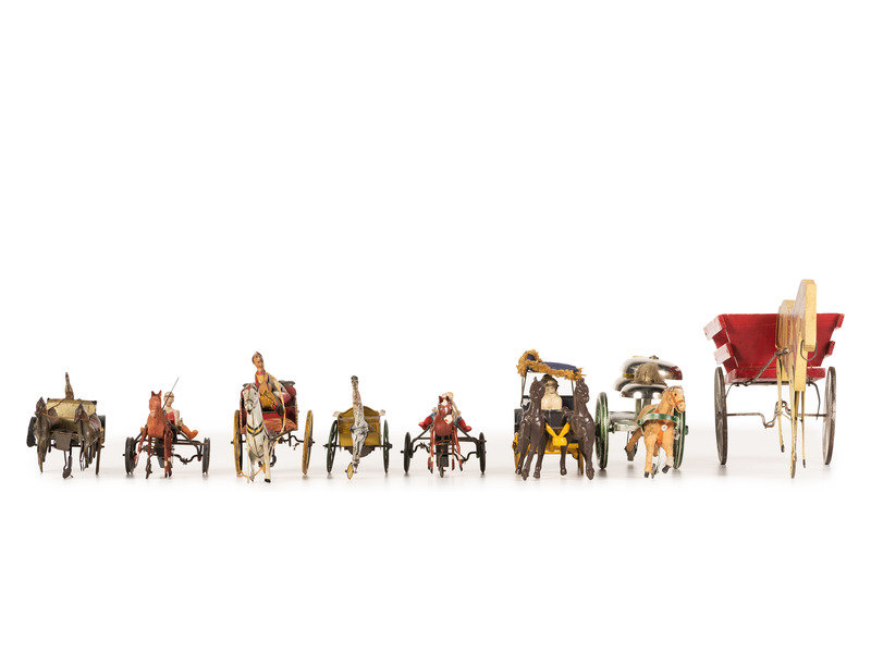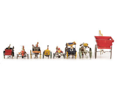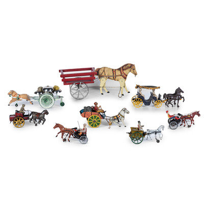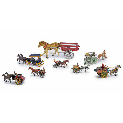 comprising a tin lithograph 'Hee Haw Balky Mule', two German windup horse and sulky toys, a G&K tin horse and sulky, a Gibbs articulated horse and cart toy, an early painted tin horse and carriage, a German horse and bell pull toy, and an American painted cast iron horse and carriage.