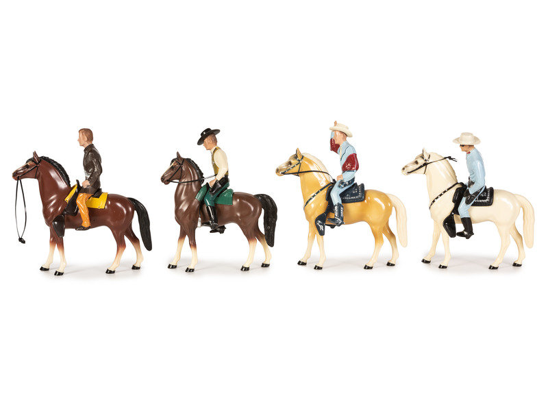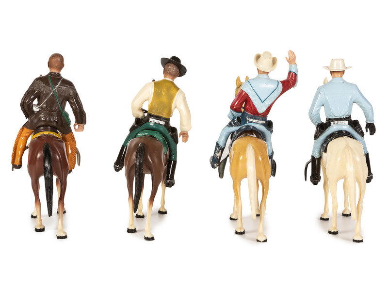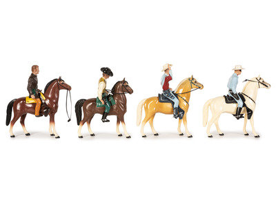 comprising The Lone Ranger, Jim Bowie, Roy Rogers, and Wyatt Earp, each mounted on horseback.