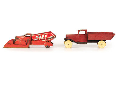comprising a Marx 'Sand/Gravel' truck, a Marx tin windup dump truck, a Buddy L fire hose truck, and two other tin trucks.