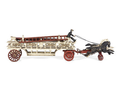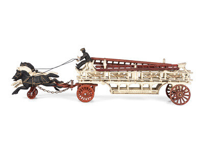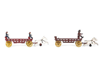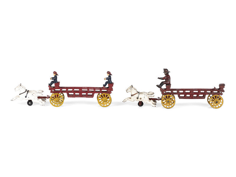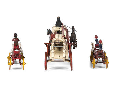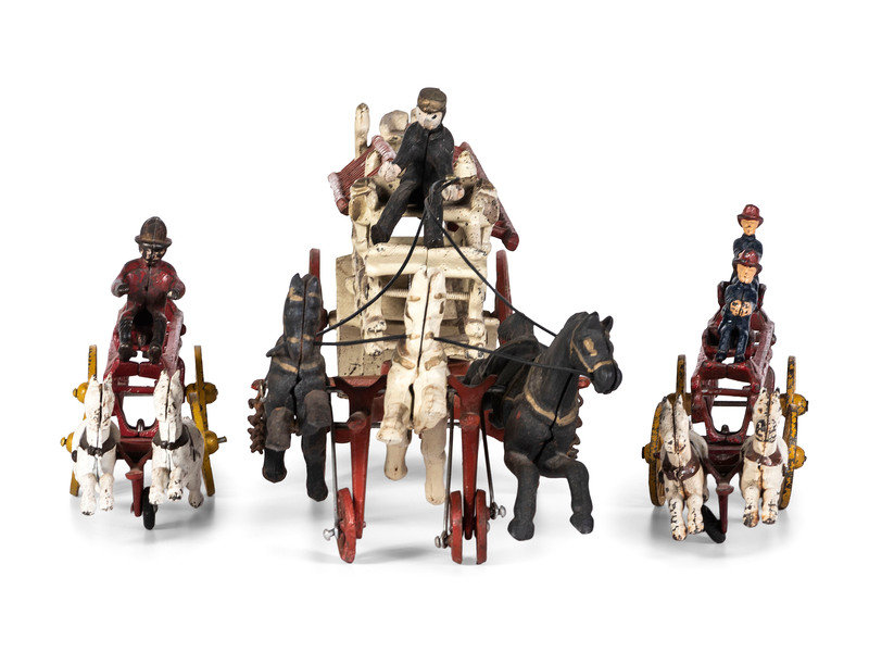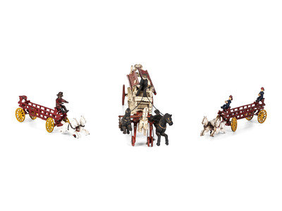 Three Painted Cast Iron Toy Horse Drawn Fire Wagons