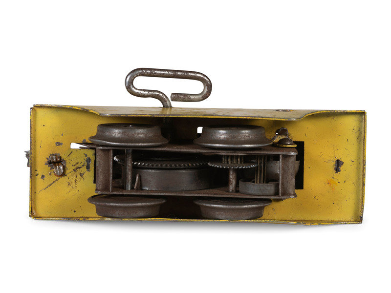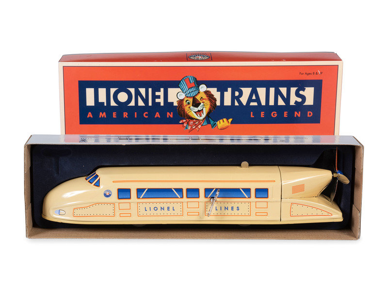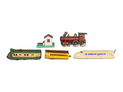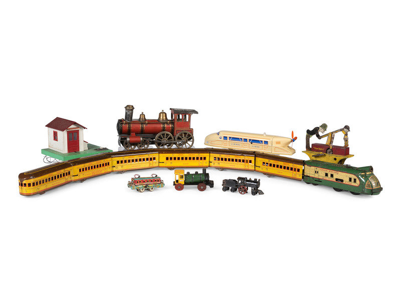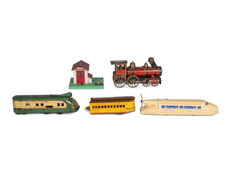 comprising a seven-car tin lithograph Union Pacific train, three tin rail cars, a cast iron rail car, a Marx 'Moon Mullins' windup hand car, and a Lionel 'Rail Zeppelin' and watchman house.