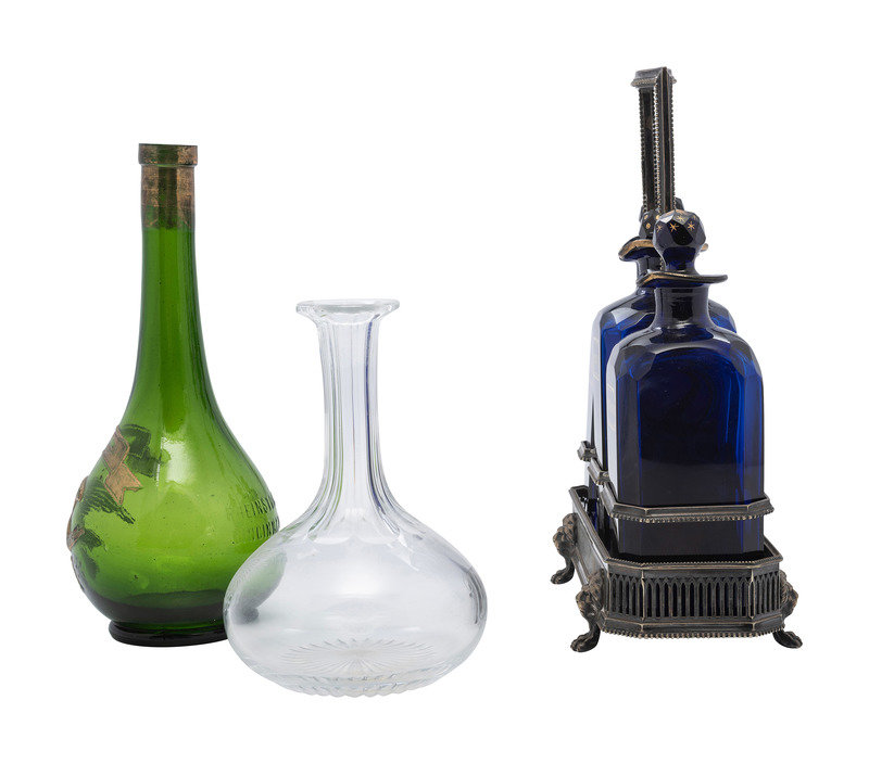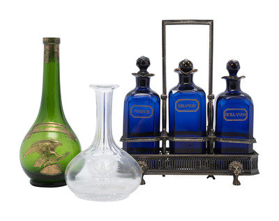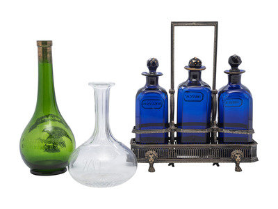 with three cobalt glass decanters.