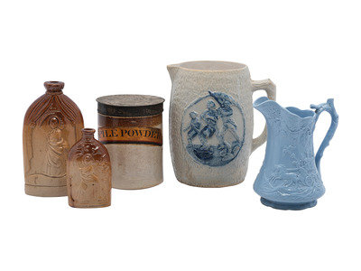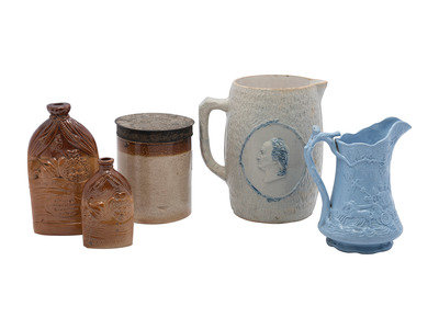 including two reform flasks, two pitchers and one lidded Pile Powder jar.