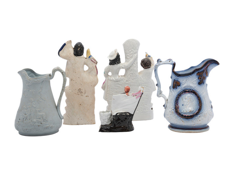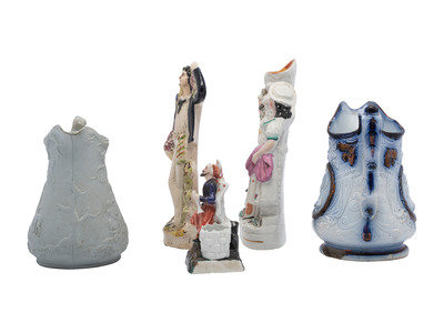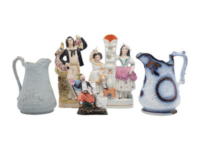 comprising a spill vase, a figure of sailor with parrot, a stoneware pitcher with hunt scene, and a portrait pitcher.