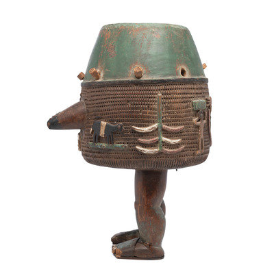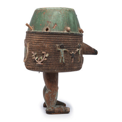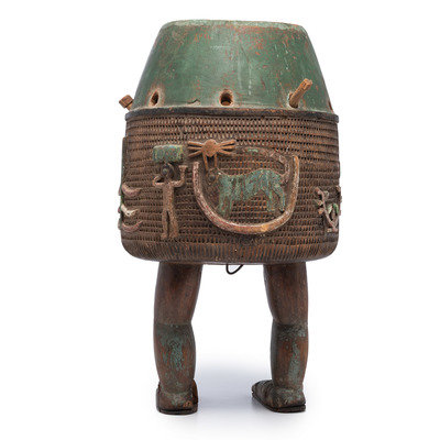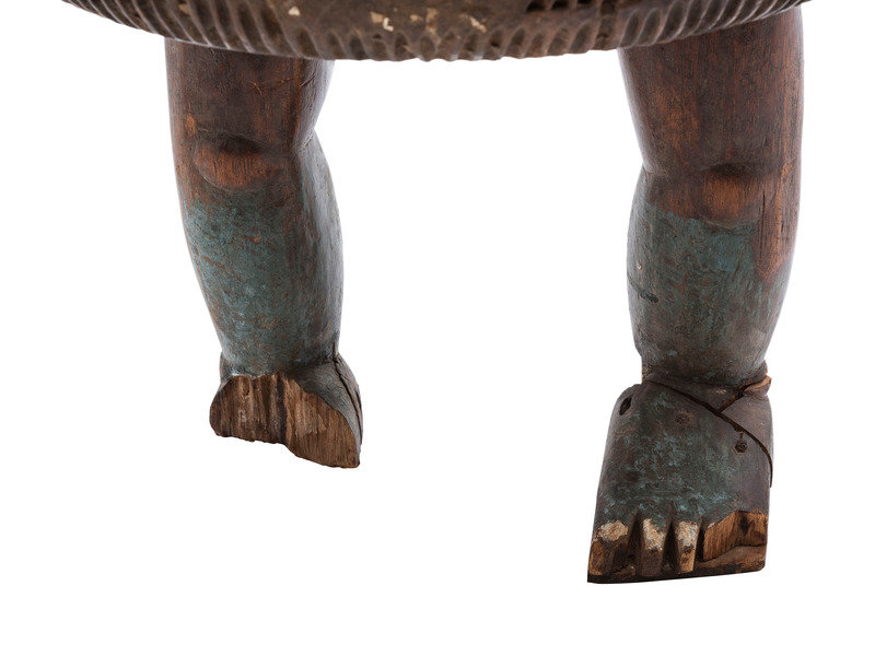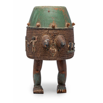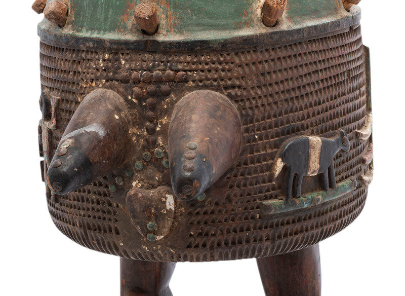 An Ashanti Carved and Gouged Painted Wood Breasted Drum