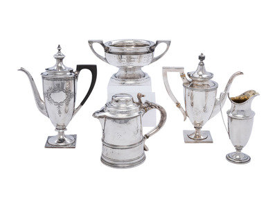 including a trophy cup, tankard, creamer, and two coffee pots.