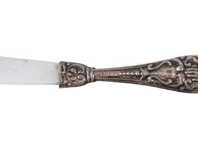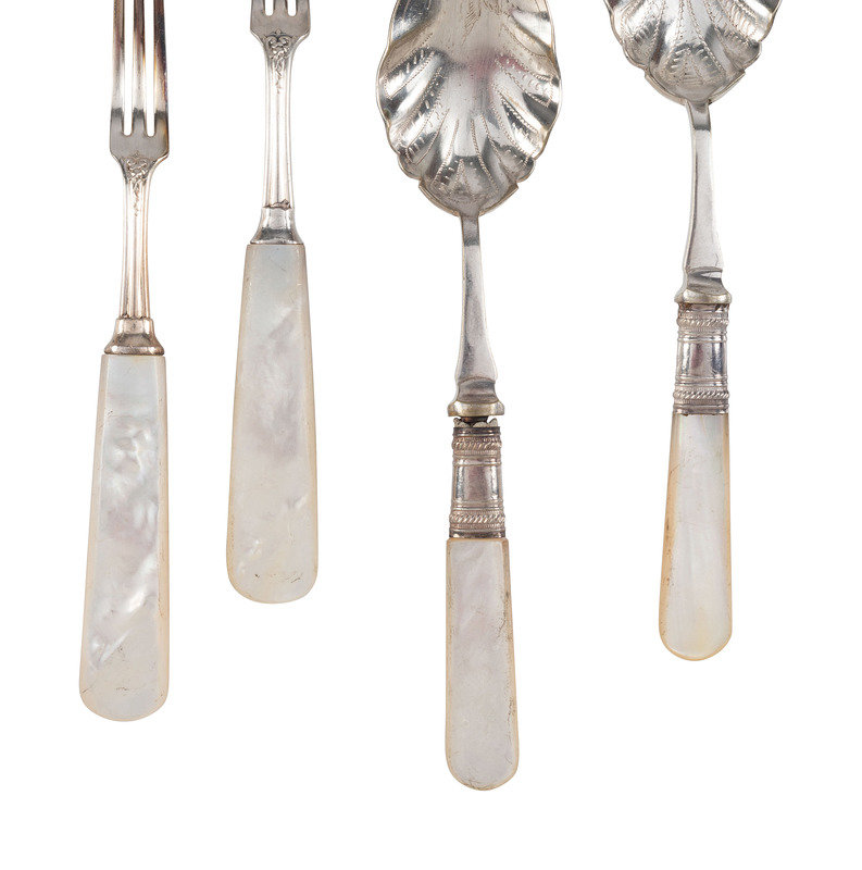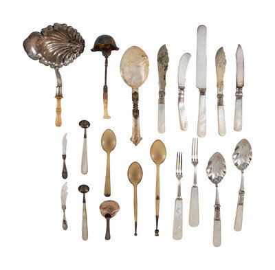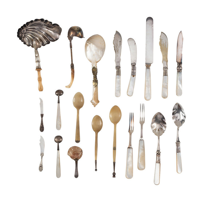 including spoons, knives, and ladles with mother of pearl, horn and wood handles.