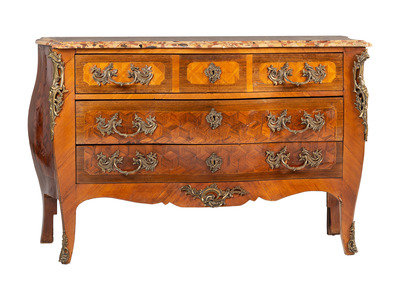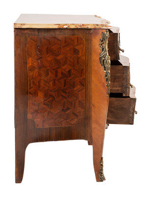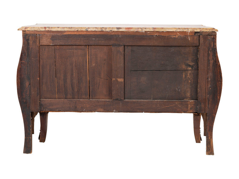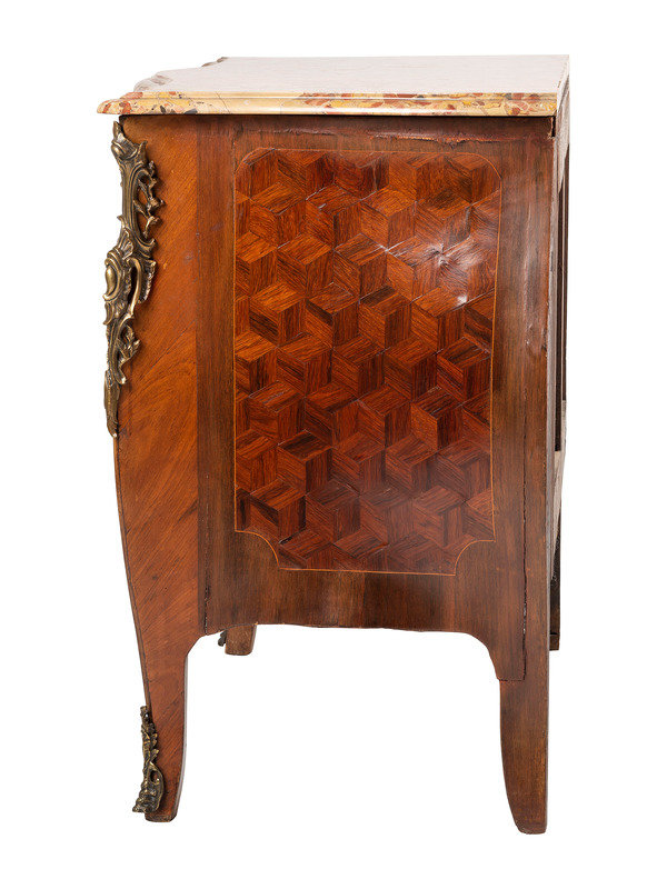A Régence Style Bronze Mounted Marble Top Marquetry Commode