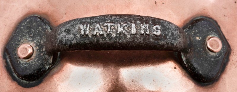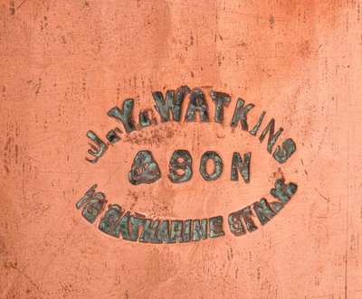 stamped J.Y. WATKINS & SON 16 CATHARINE ST N.Y. to both pot and cover, further stamped WATKINS on iron handle.