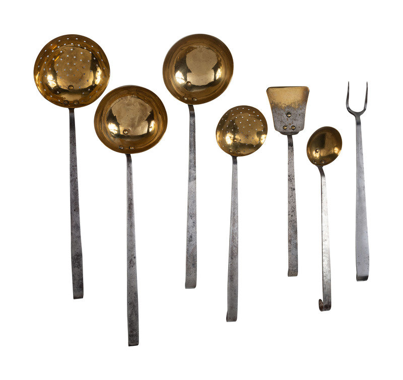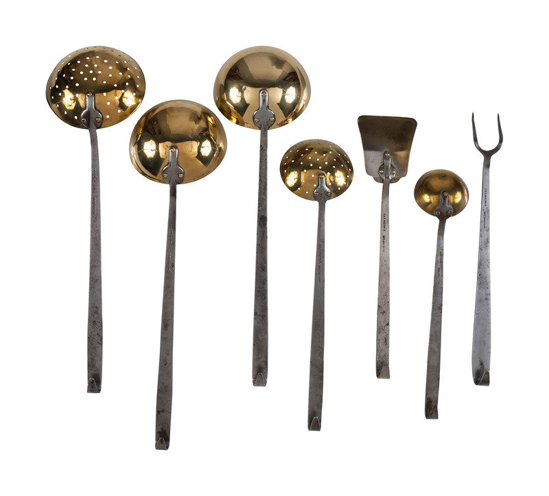 Seven American Brass and Wrought Iron Cooking Utensils
