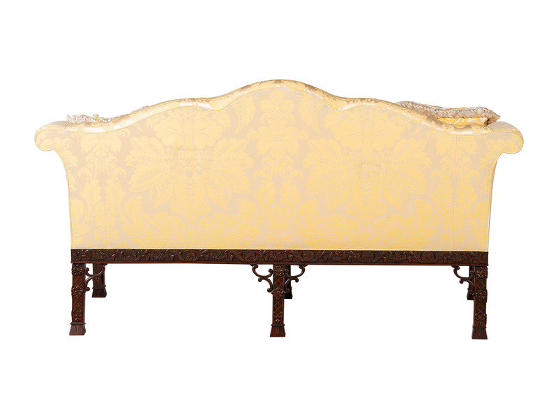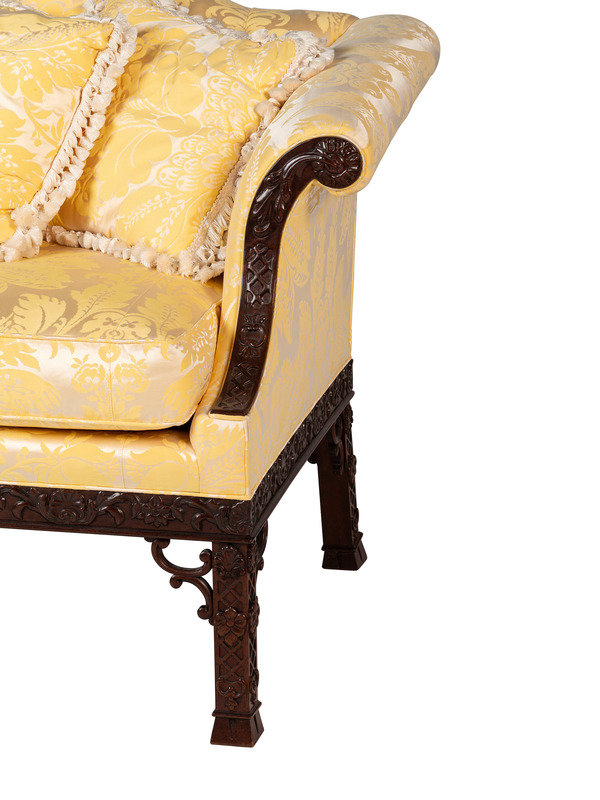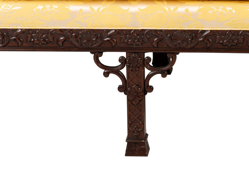 A Baker Chinese Chippendale Style Yellow Damask Upholstered Mahogany Settee
