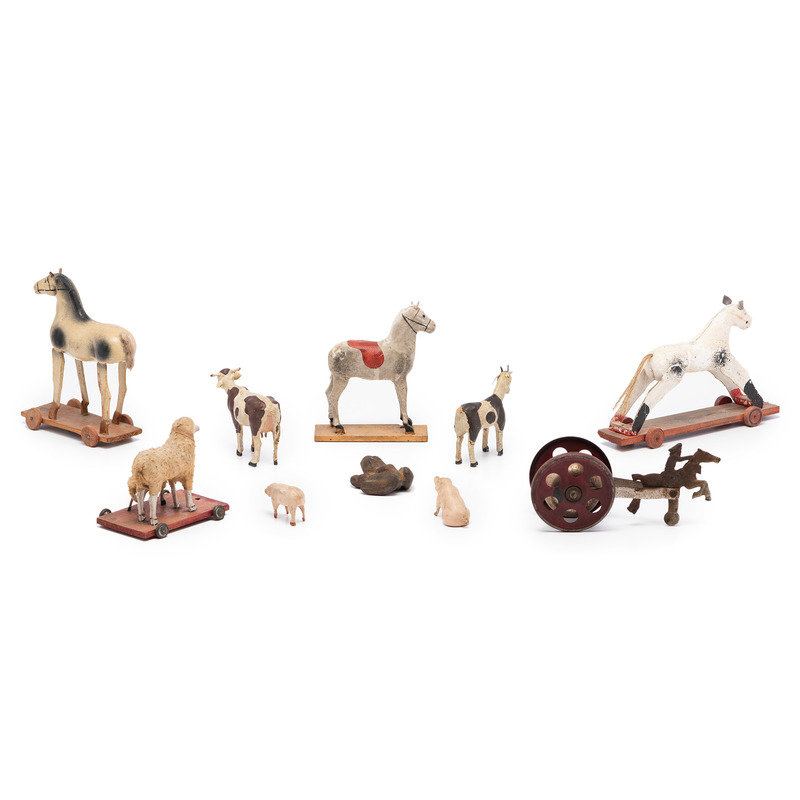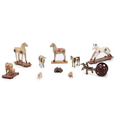 comprising three horse pull toys, a wooly sheep pull toy, two pig figures, a cow figure, and a goat figure.