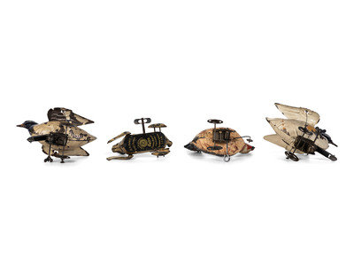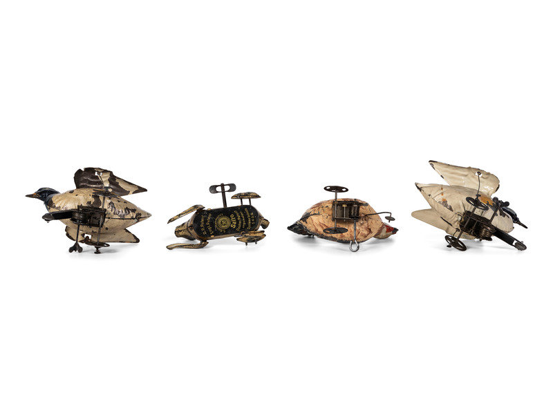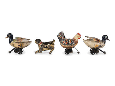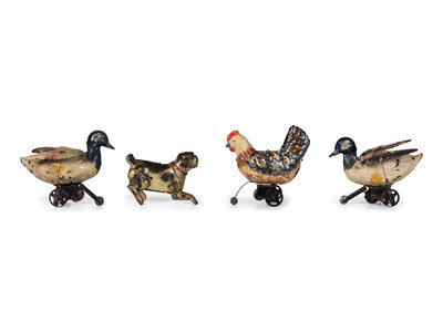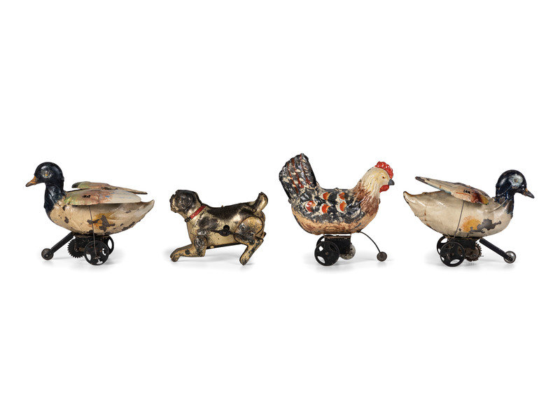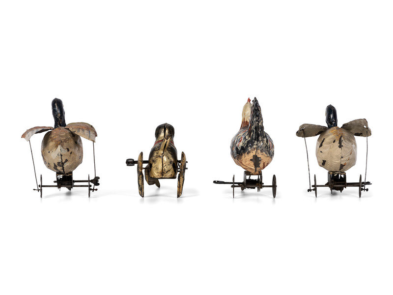 together with three unmarked, hand-painted tin birds, consisting of two ducks and a hen.