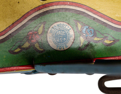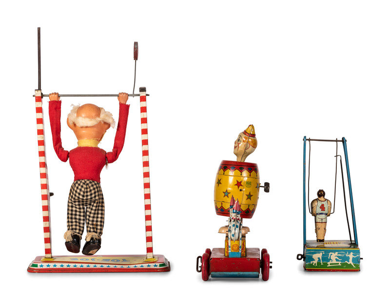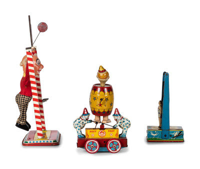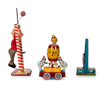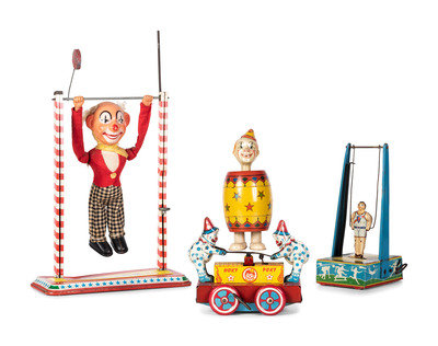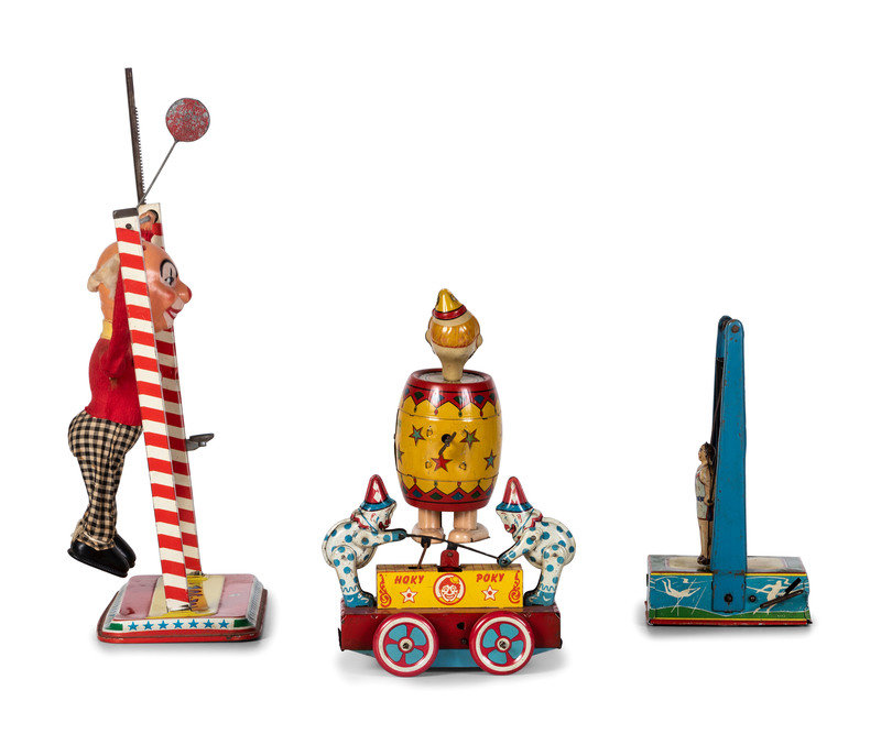 comprising a Wyandotte 'Hoky Poky' windup toy, a Chein tin windup clown in barrel toy, a Wyandotte tin windup trapeze, and an Ohio Art 'Toe Joe' trapeze.