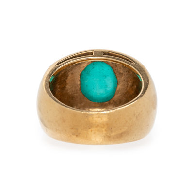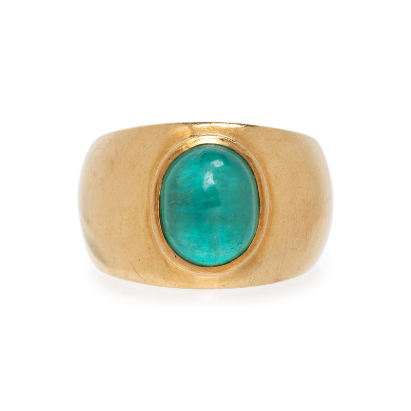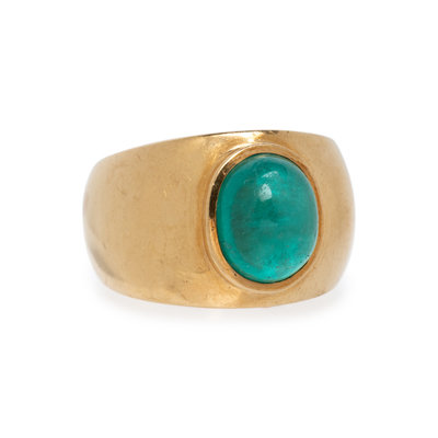 Containing one oval cabochon emerald measuring approximately 10.80 x 8.65 x 7.40 mm. Ring size 7.