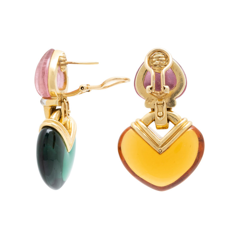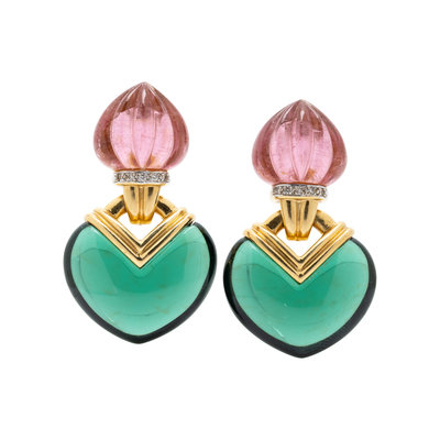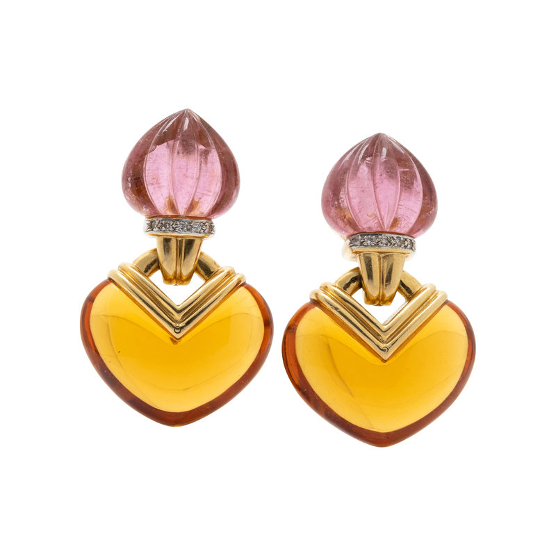 Consisting of earclips containing melon carved pink tourmalines and 10 round brilliant cut diamonds, with interchangeable citrine and green quartz drops, posts with clip backs. 1 5/8 inches long.