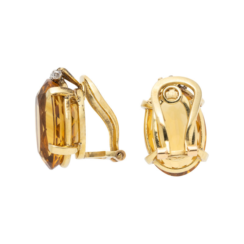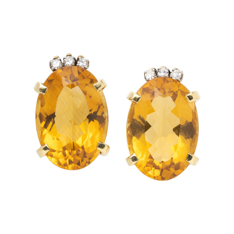 Containing two oval mixed cut citrines measuring approximately 16.80 x 11.75 x 8.00 mm and six single cut diamonds. Mounted in yellow gold. 3/4 inch long.