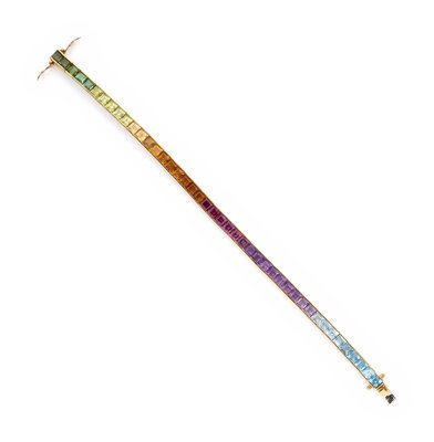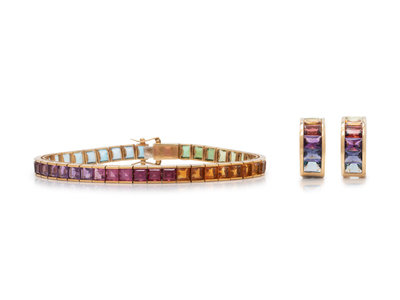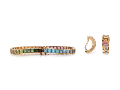Consisting of a bracelet containing numerous square step cut gemstones of various colors, together with a pair of earclips containing 12 rectangular mixed cut gemstones of various colors. Bracelet: 7 1/4 inches long. Earclips: 3/4 inch long.