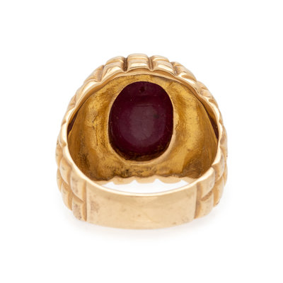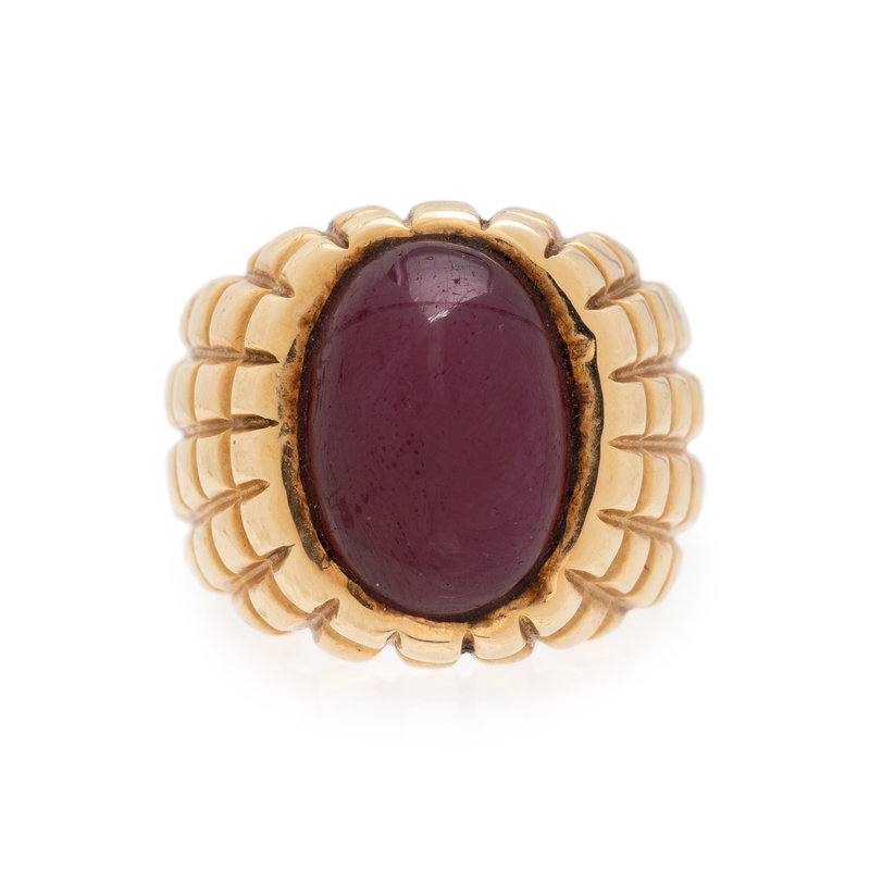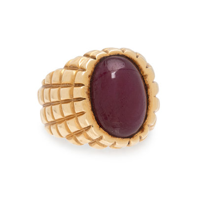 Containing one oval cabochon ruby measuring approximately 14.30 x 10.10 x 6.70 mm. Ring size 7 1/4.