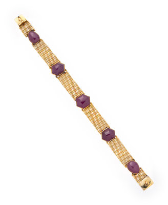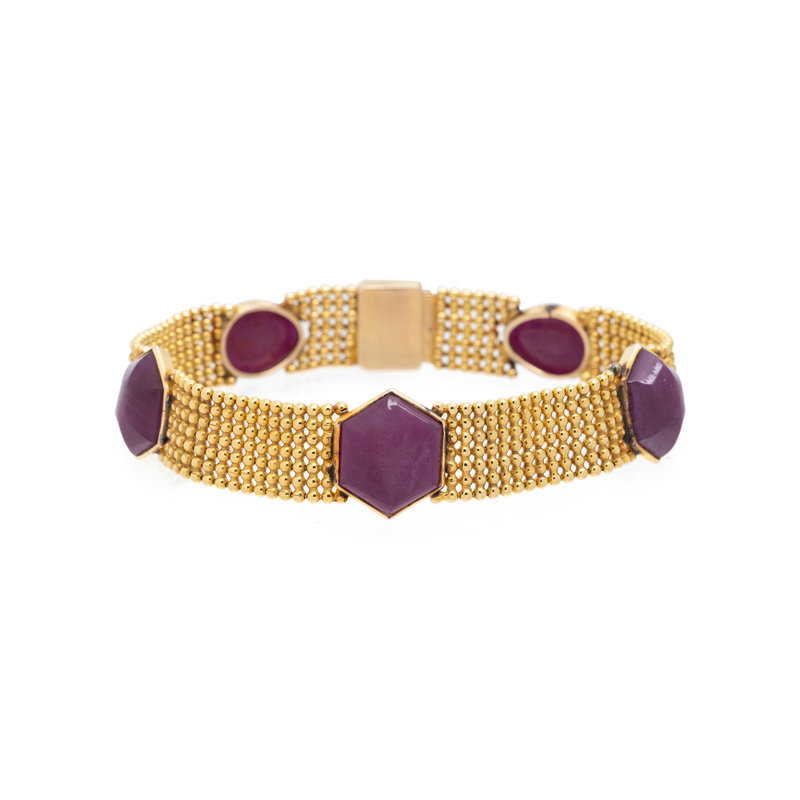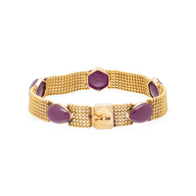 Containing two pear and three hexagonal ruby cabochons. 7 1/2 inches long.