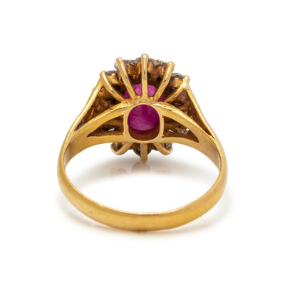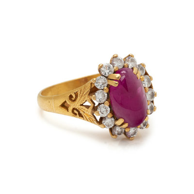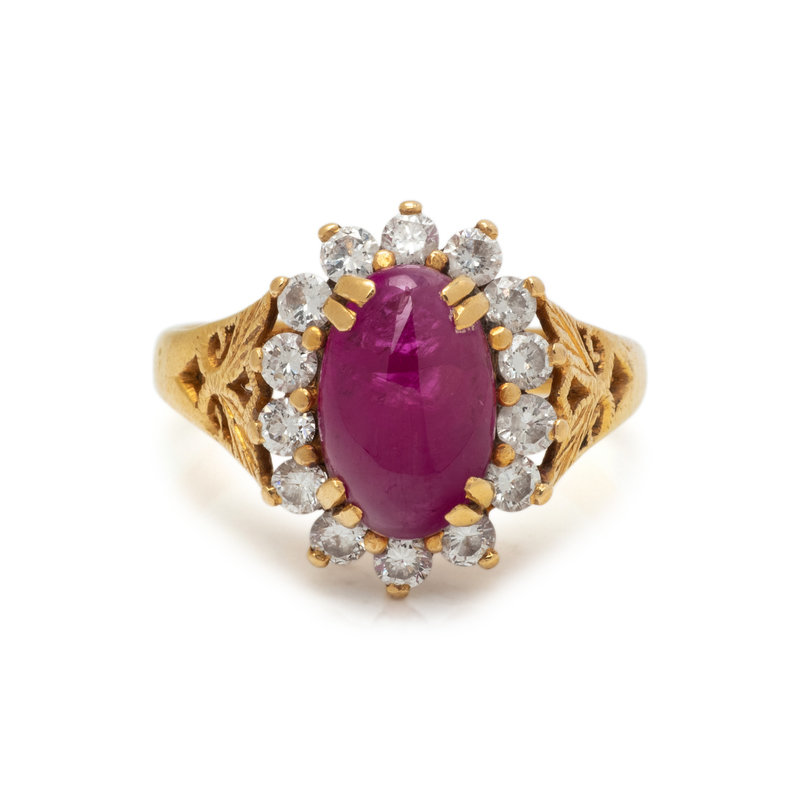 Containing one oval cabochon ruby measuring approximately 10.75 x 6.90 x 3.50 mm and 14 round brilliant cut diamonds weighing approximately 0.70 carat total. Mounted in yellow gold. Ring size 7.