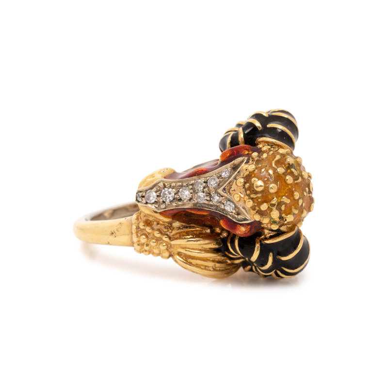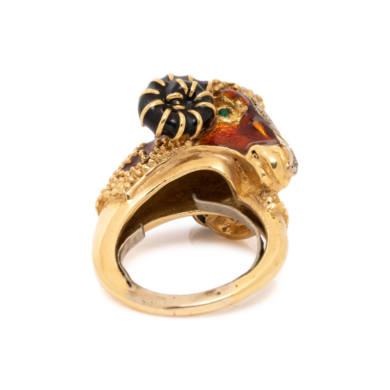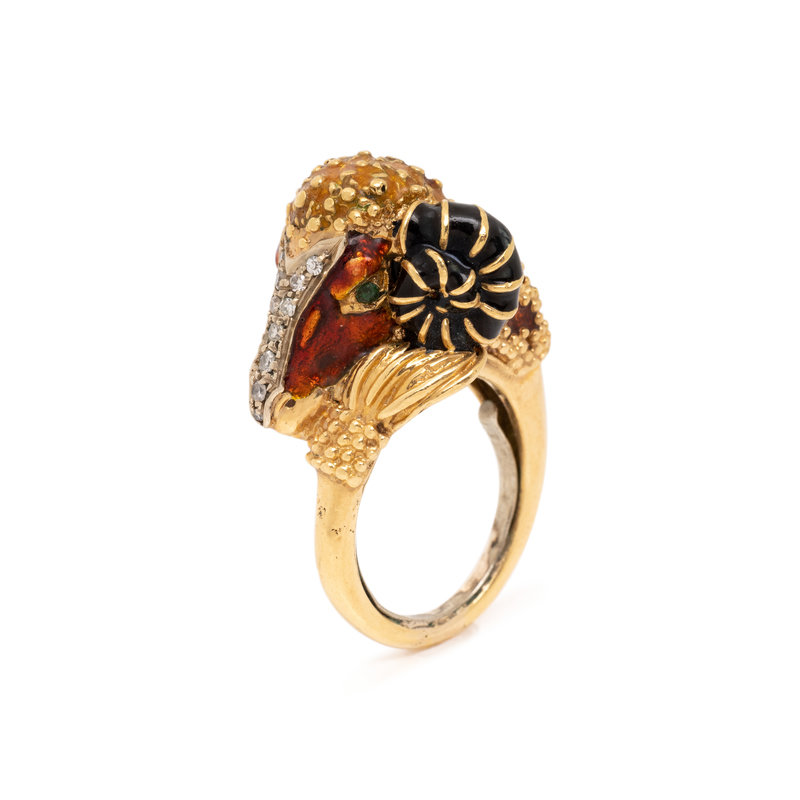 YELLOW GOLD, DIAMOND AND ENAMEL RAM'S HEAD RING