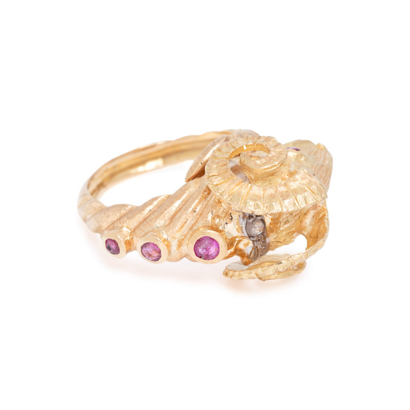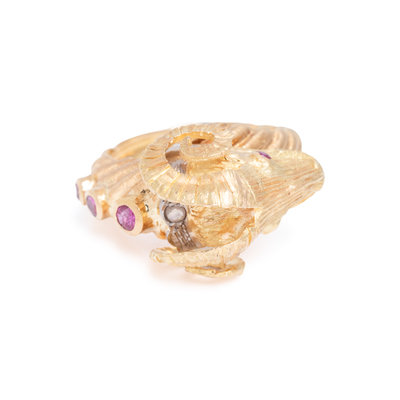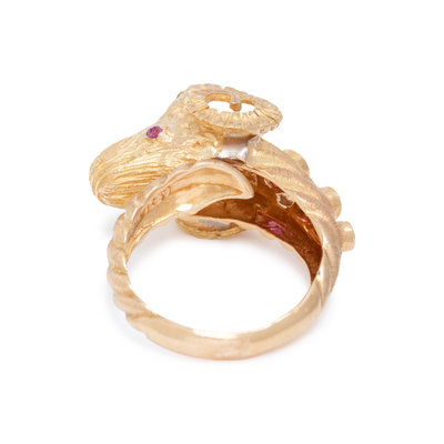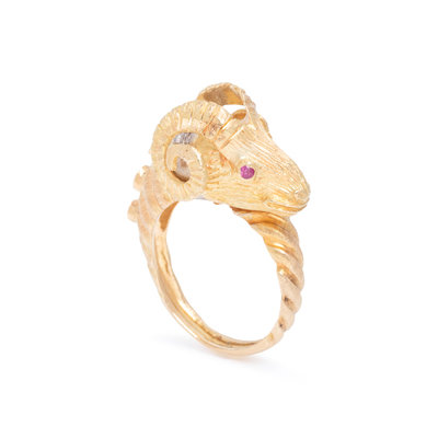 LALAOUNIS, YELLOW GOLD AND RUBY RAM'S HEAD RING