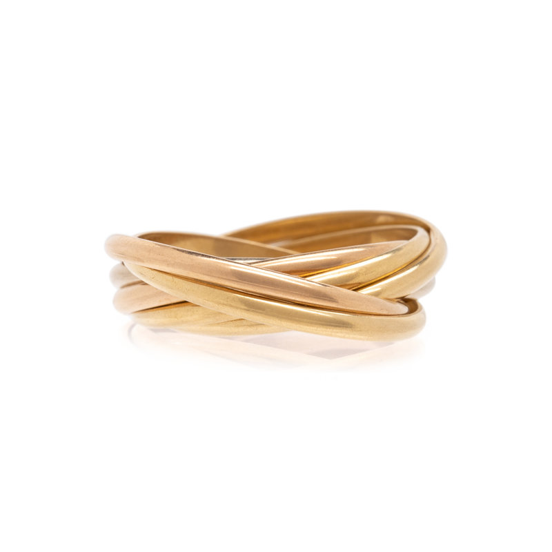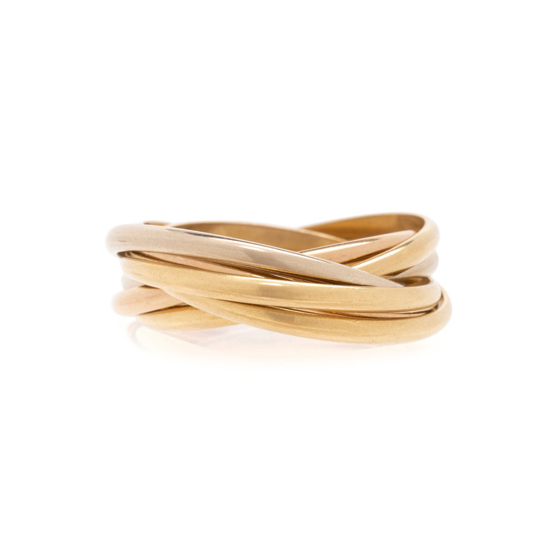 Consisting of white, yellow and rose gold interlocking bands. Ring size 6.