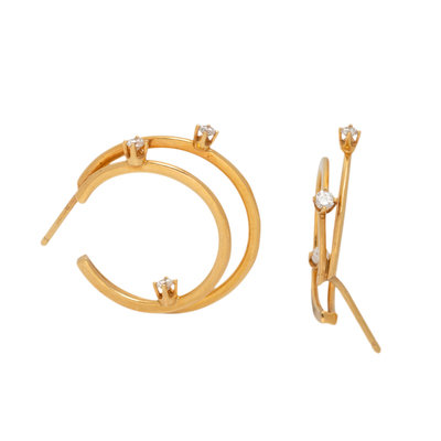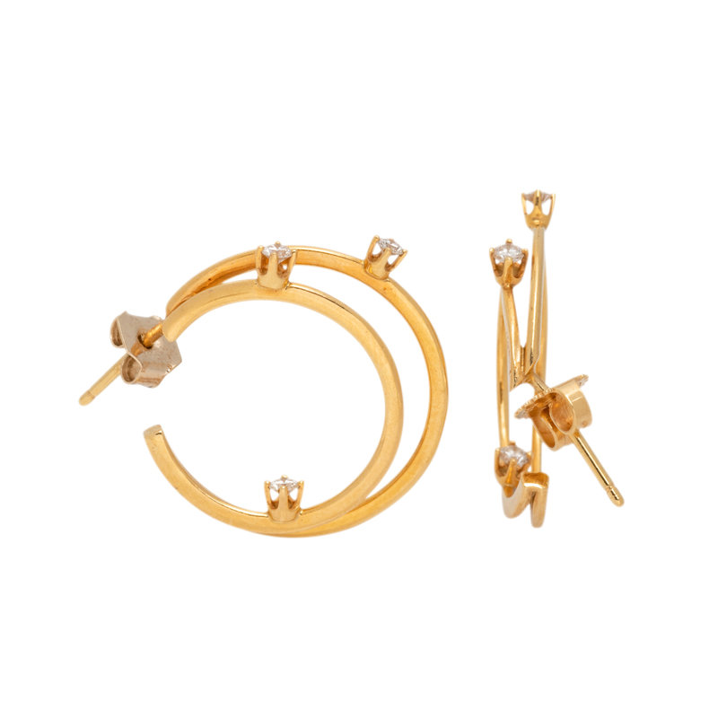 Consisting of a double hoop design containing six round brilliant cut diamonds. 3/4 inch long.