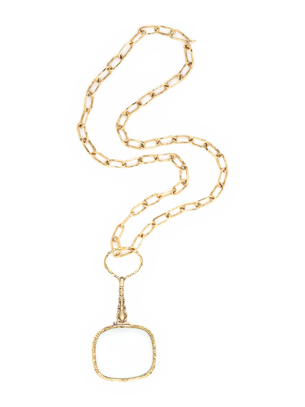Consisting of a foliate engraved magnifying glass pendant, suspended from a hammered oval link chain. 30 inches long.