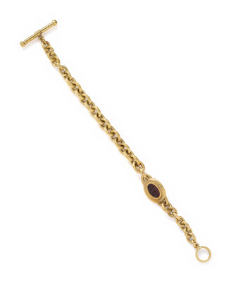 Consisting of an oval link chain containing one oval intaglio depicting the sun and moon, with toggle clasp. 7 1/2 inches long.