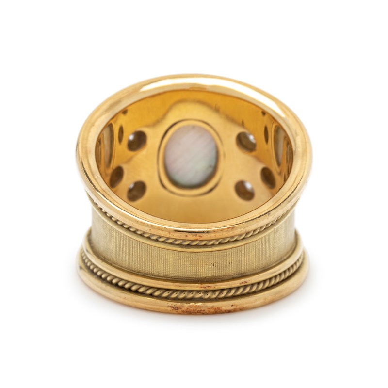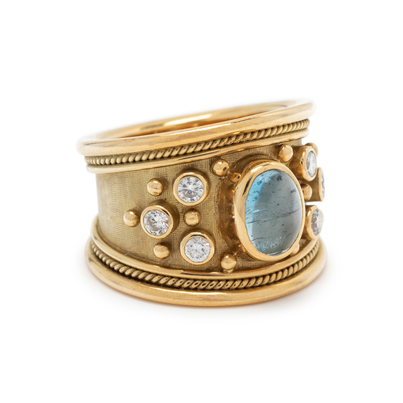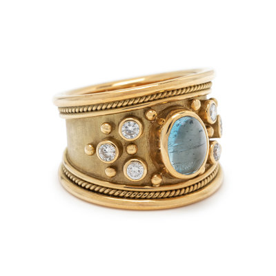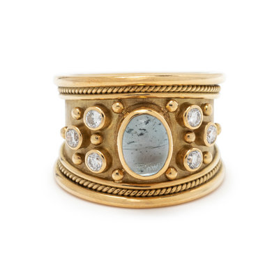 ELIZABETH GAGE, YELLOW GOLD, AQUAMARINE DOUBLET AND DIAMOND RING