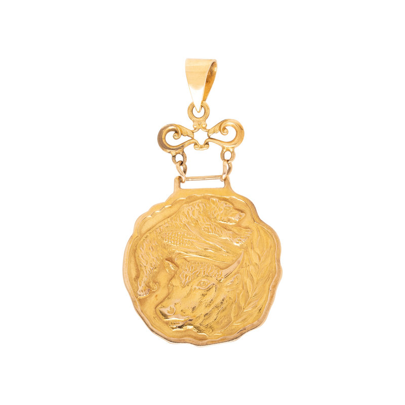 Consisting of a pendant depicting bull and a bear, the reverse with personalized engraving. 2 1/2 inches long.