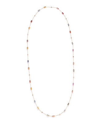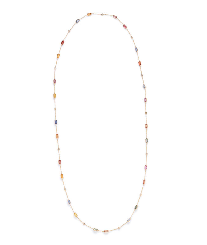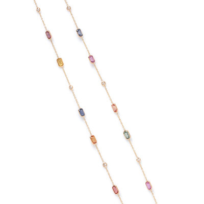Consisting of a cable link chain interpersed with 26 emerald cut sapphires of various colors and 13 round brilliant cut diamonds weighing approximately 0.65 carat total. 27 inches long.