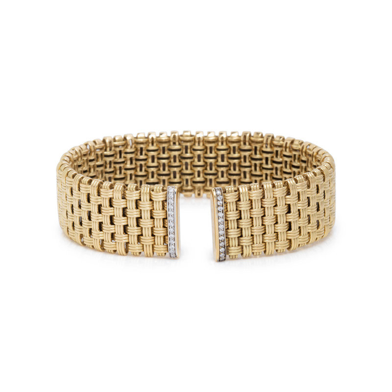 Consisting of a semi-flexible woven design containing 26 round brilliant cut diamonds. 6 1/2 inches inner circumference.