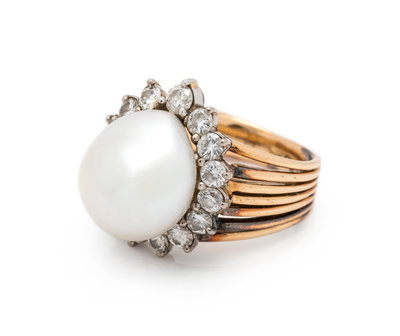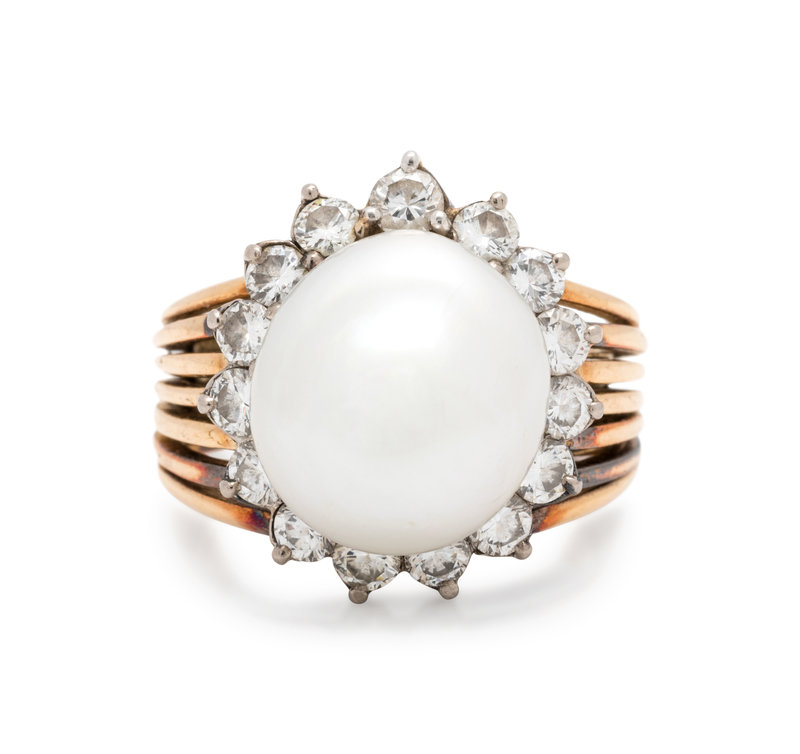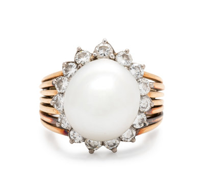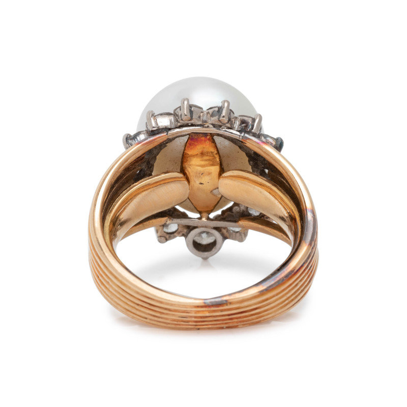 Containing one pearl measuring approximately 14.10 x 12.55 mm and 15 round brilliant cut diamonds weighing approximately 1.20 carats total. Mounted in bicolor gold. Ring size 6 1/4.