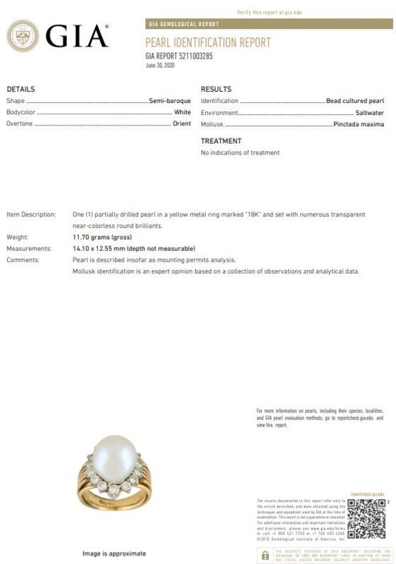 GIA, 2020, Report number 5211003285, Cultured Pearl, Saltwater, Pinctada Maxima species, White body color, Orient overtone