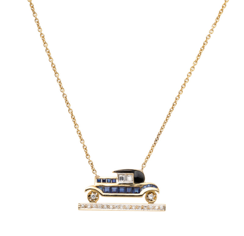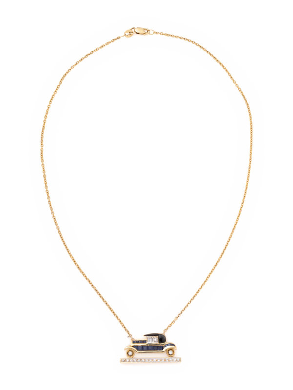 YELLOW GOLD, SAPPHIRE AND DIAMOND CAR NECKLACE