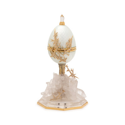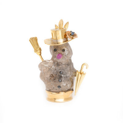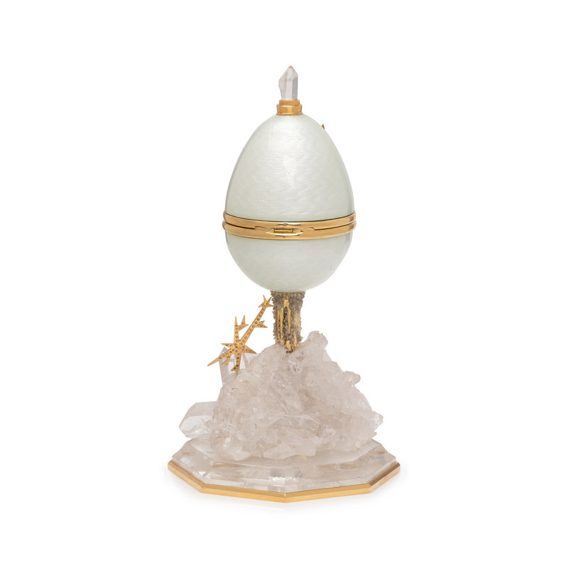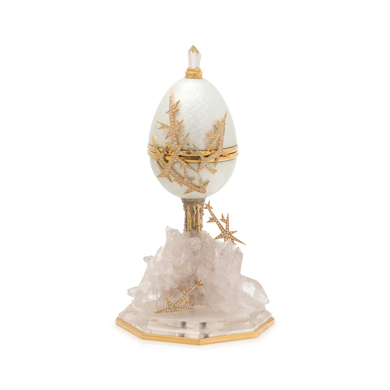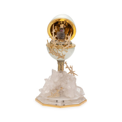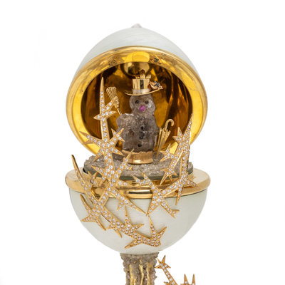 Consisting of a yellow gold and white guilloche enamel hinged egg on a pedestal containing numerous round brilliant cut diamonds weighing approximately 2.60 carats total and rough quartz crystals, the egg opening to reveal a removable magnetic rough diamond snowman pendant containing five black diamonds (origin of color not tested), one sapphire and one ruby. 6 1/4 x 3 1/4 x 3 1/4 inches.
