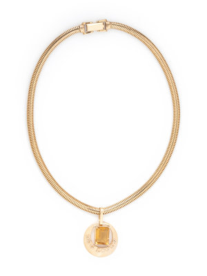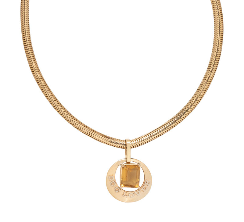 Consisting of a flattened snake chain suspending a DOG LOVER pendant containing one emerald cut citrine measuring approximately 13.15 x 10.20 x 6.85 mm. 15 1/2 inches long.